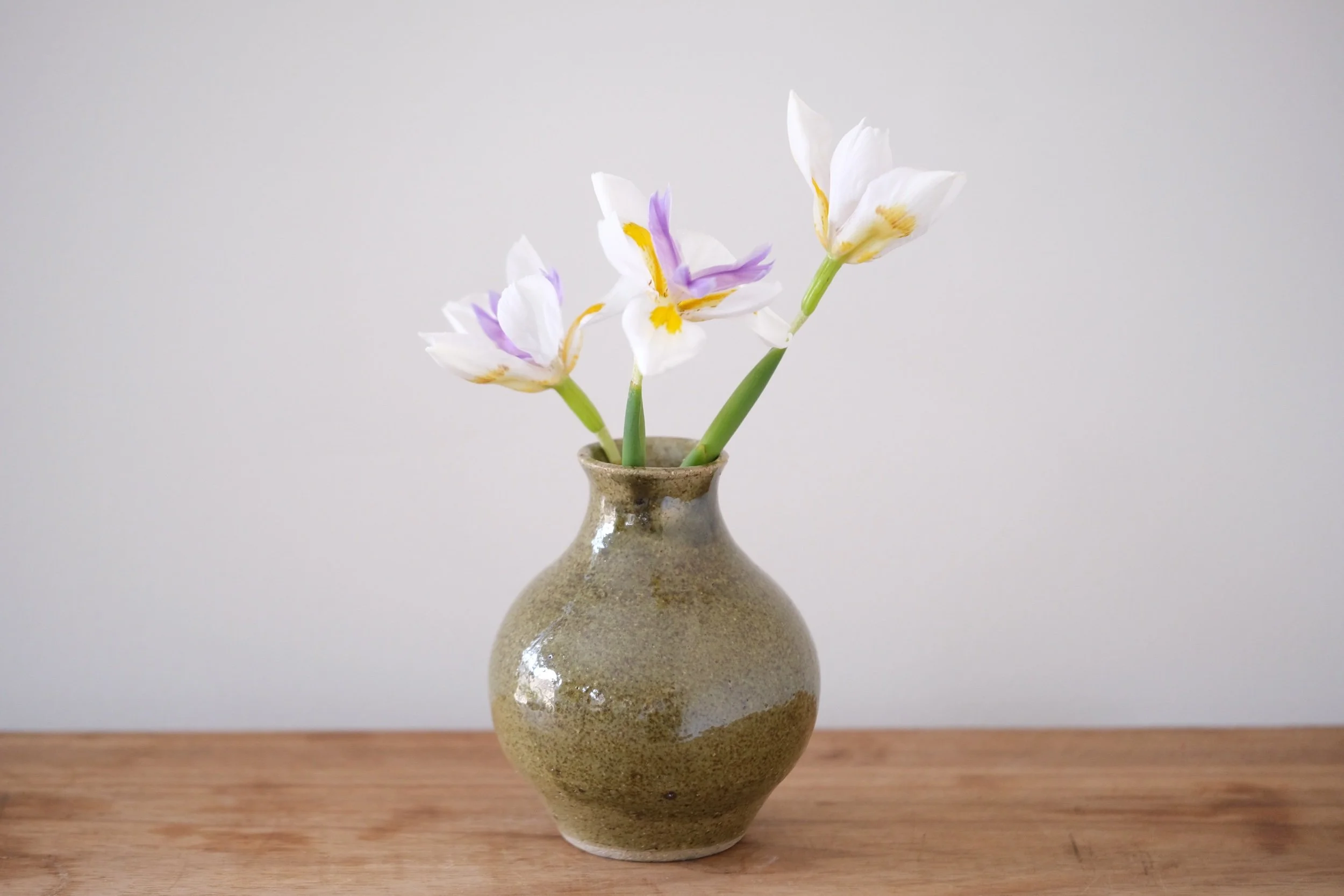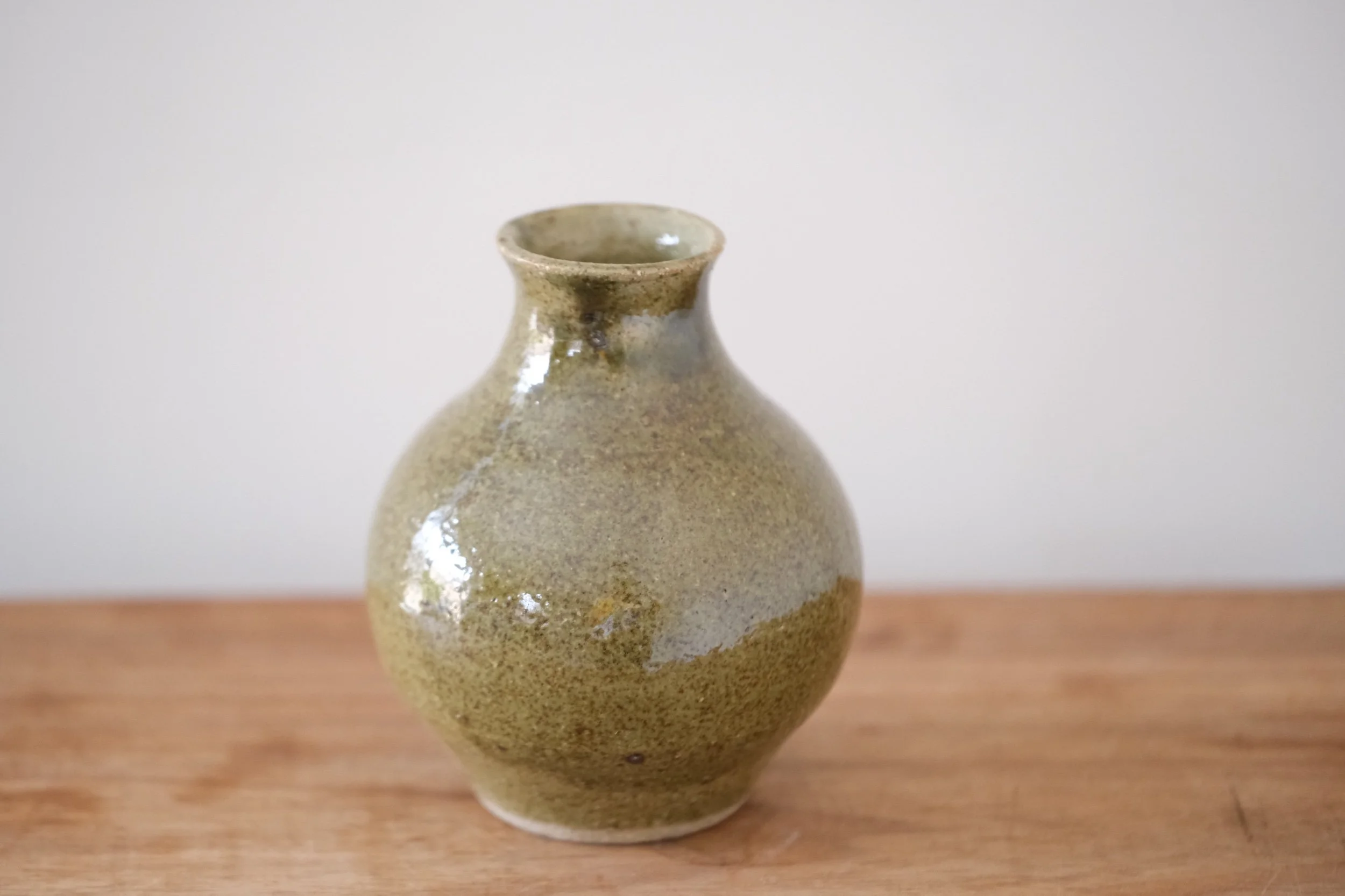 A small vase perfect for stems from your garden. This vase is wheel thrown in an iron rich stoneware clay and glazed with a mottled green glaze.